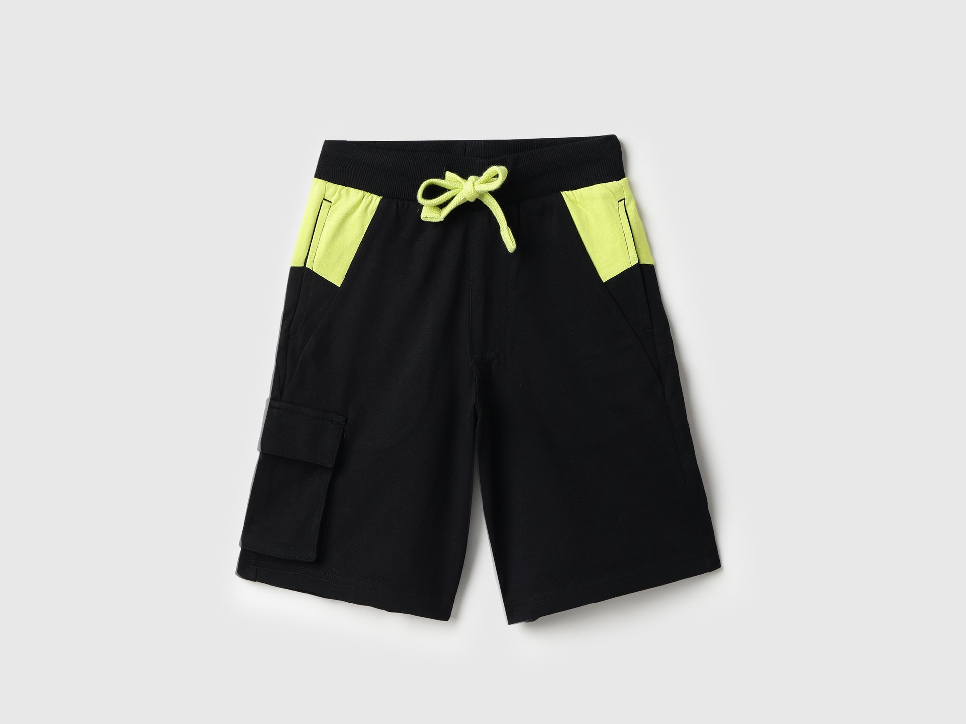 100% cotton boys black relaxed fit cargo shorts with color block design for breathable comfort.