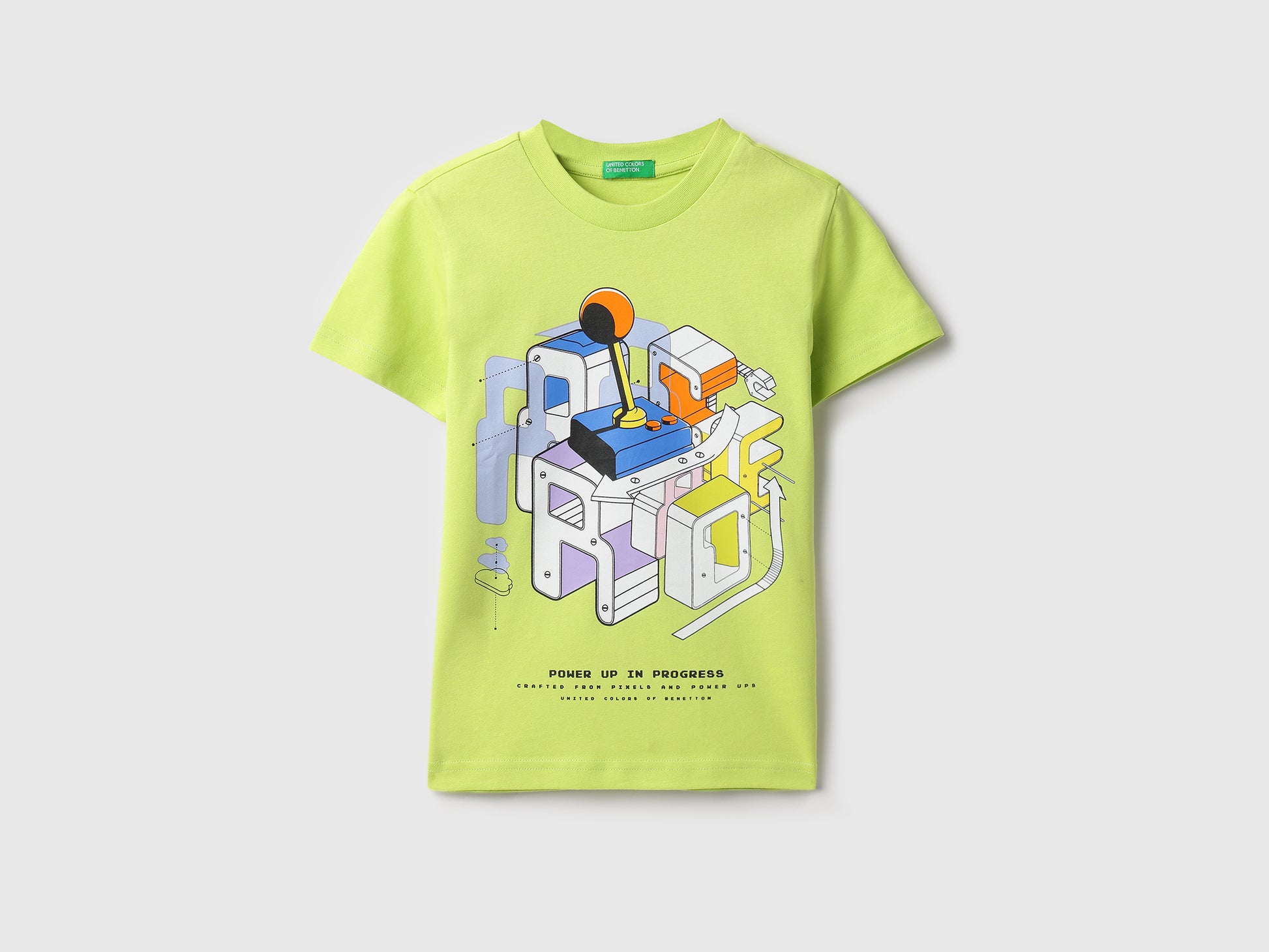 Parrot green cotton T-shirt for boys with regular fit, round neck, and arcade front print. Breathable and comfortable for everyday casual wear.