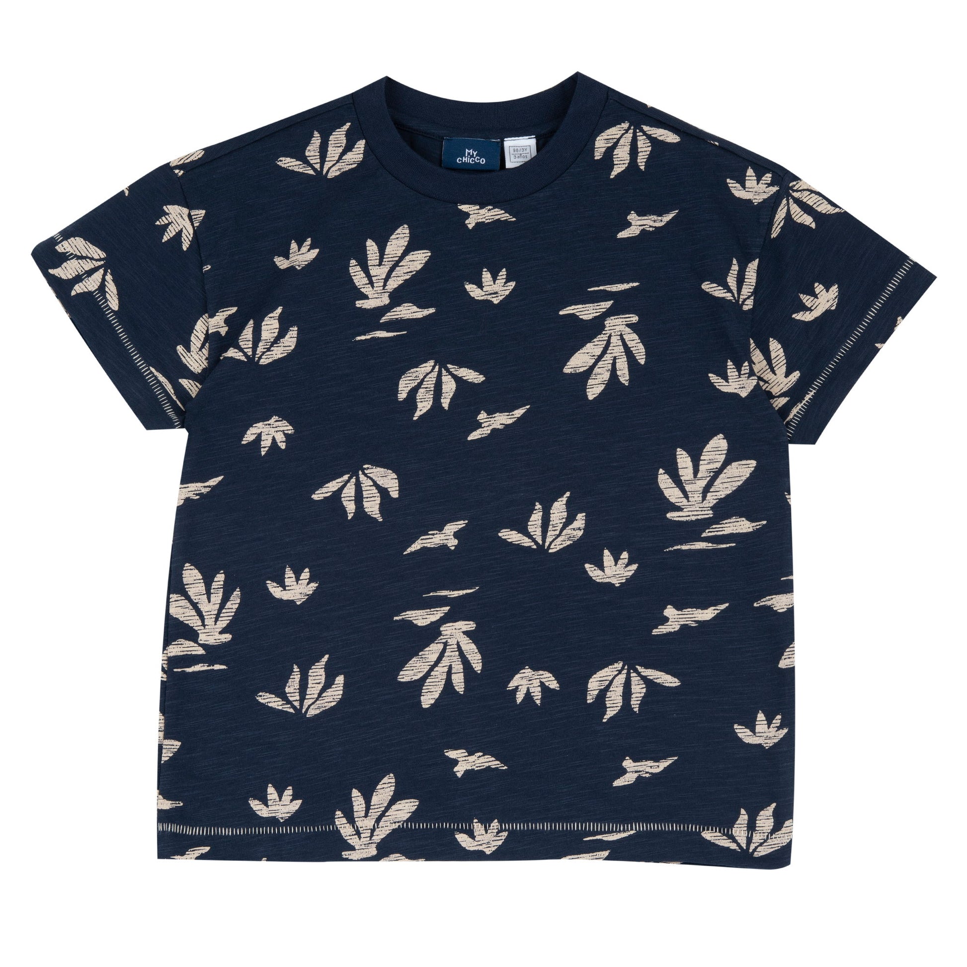 Dark Blue Floral Printed Cotton Short Sleeve T-Shirt for Boys