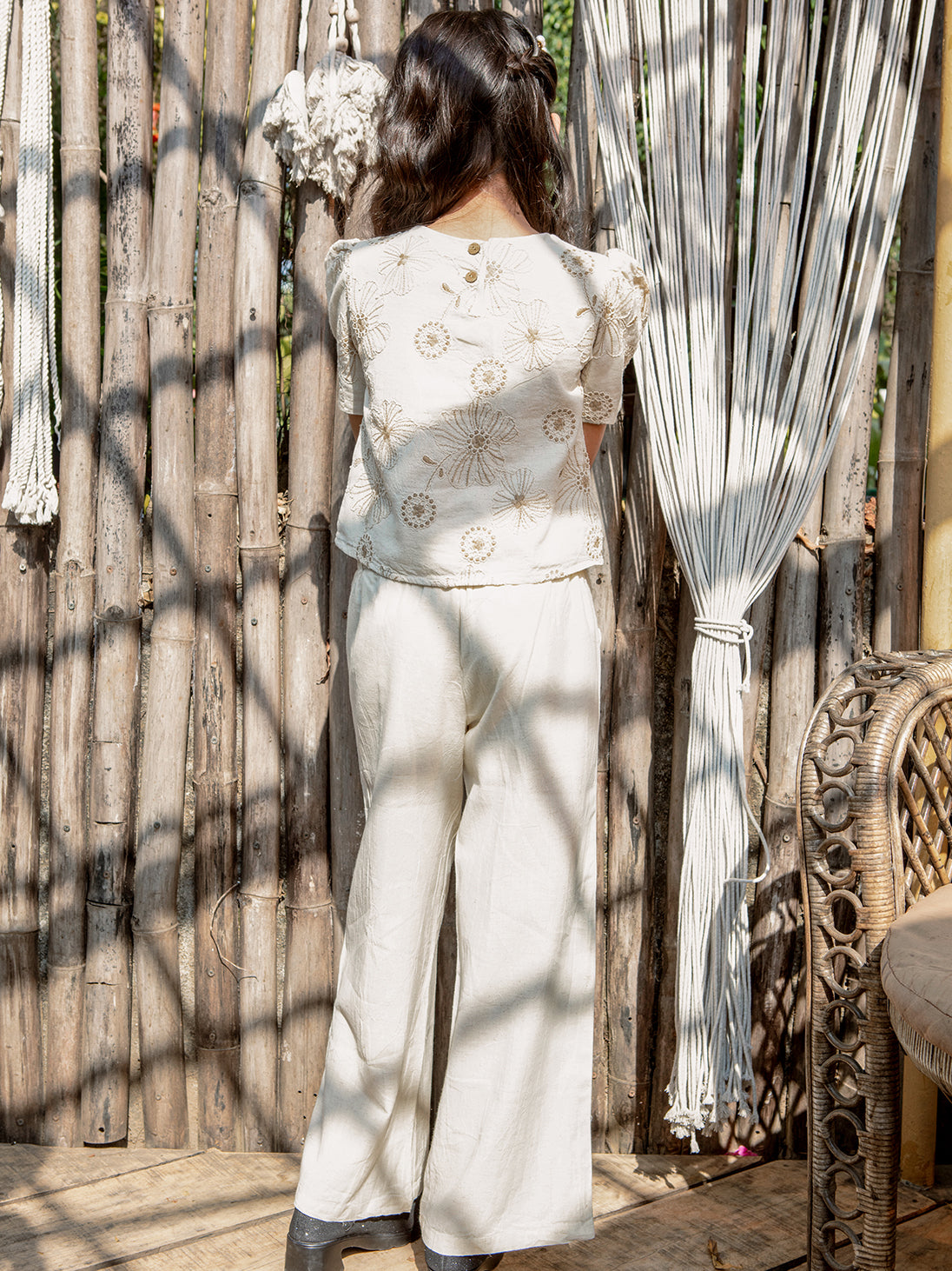 Light woven cord set with embroidery, regular fit, and elastic waist for comfortable semi-casual wear.
