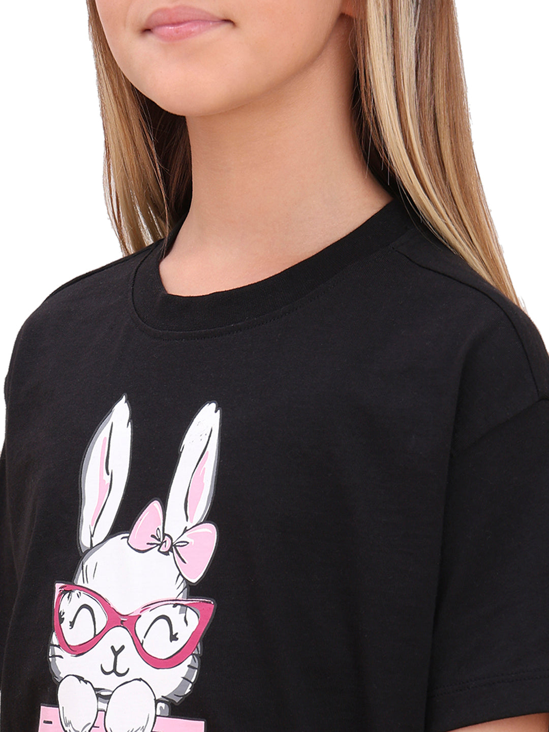 Jet Black Quirky Graphic Cotton T-Shirt with Round Neck for Girls